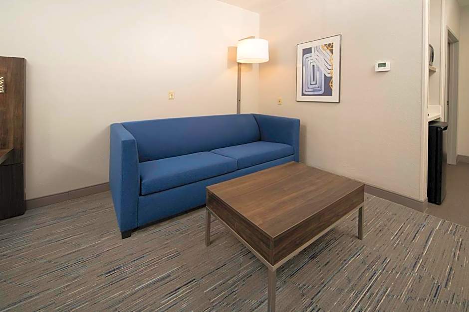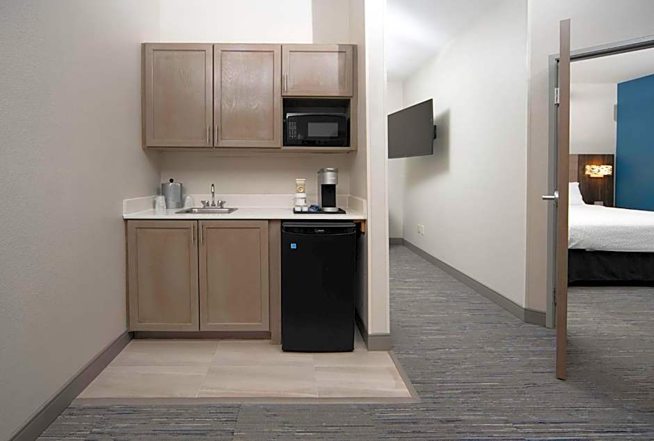 A seating area with a flat-screen TV is featured in this room. A microwave, refrigerator, and coffee machine are included.